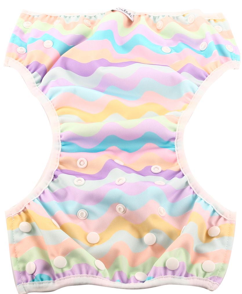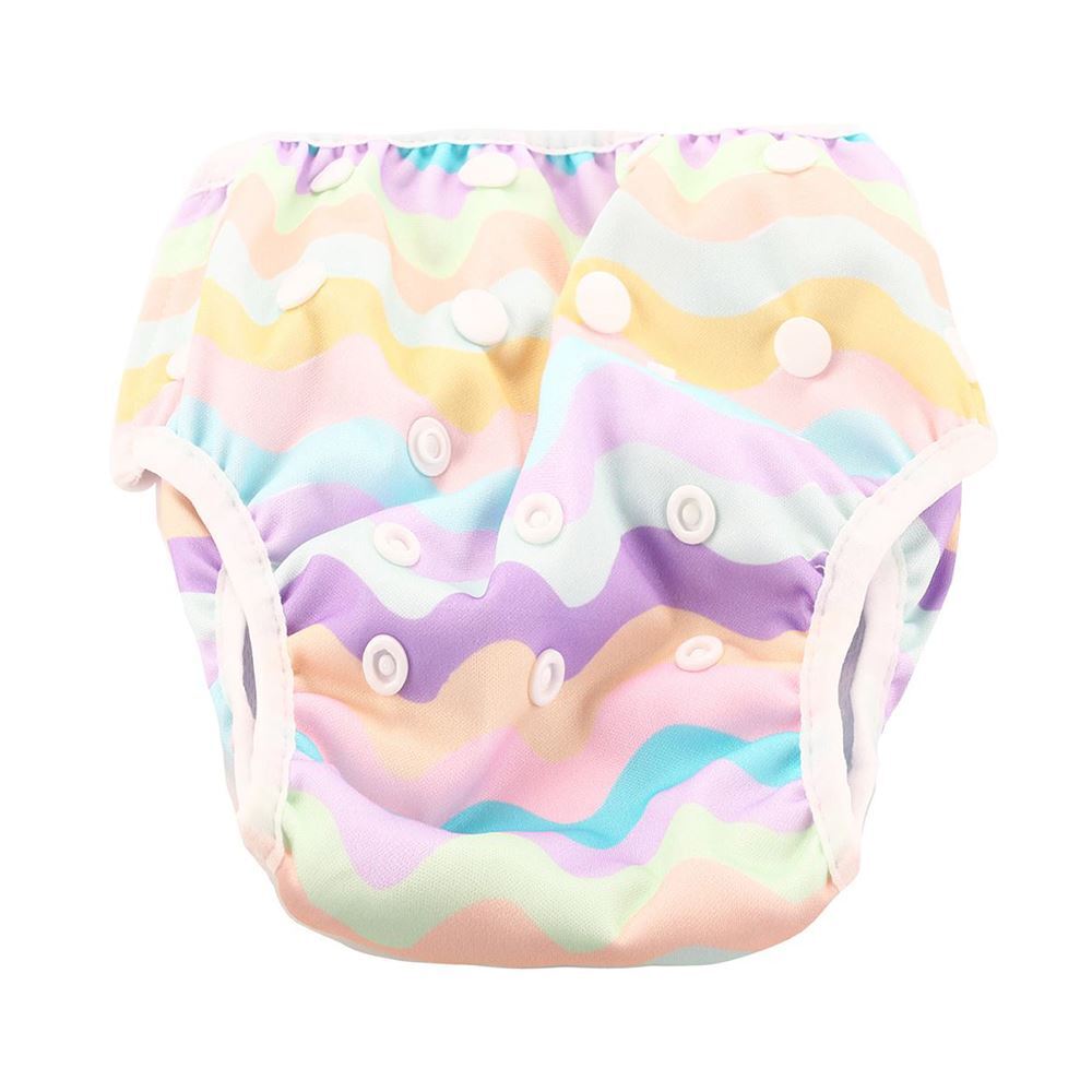 - Has a built in system of snaps to easily adjust the size across the waistband as well as the length of the swim nappy.